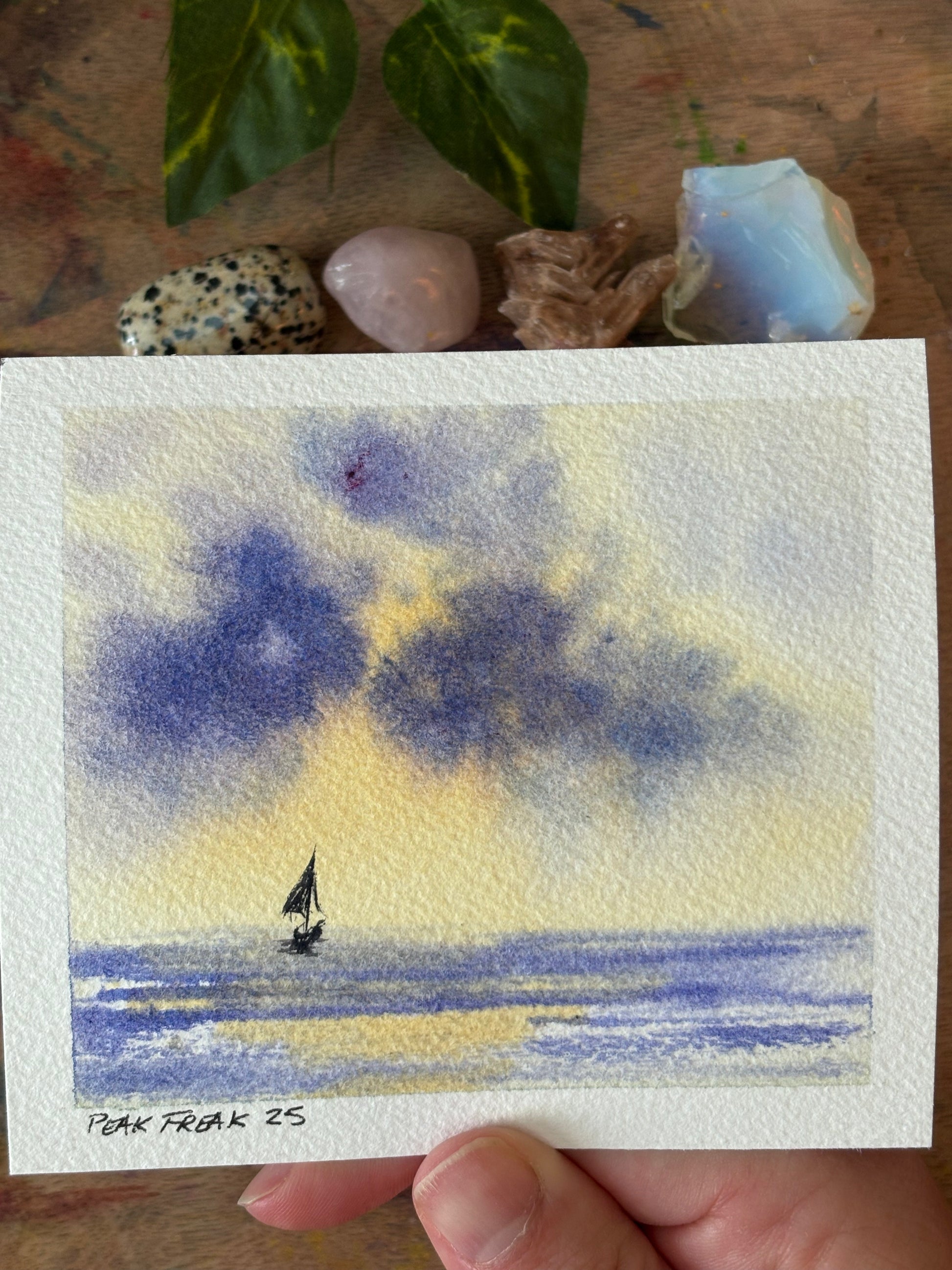 “Compass Within” is a deeply intuitive watercolor piece born from a place of trust and flow. With no plan in mind, each brushstroke was guided by instinct resulting in a serene seascape where a lone sailboat drifts beneath a moody, glowing sky. It’s a quiet reminder that sometimes the clearest direction comes from within.