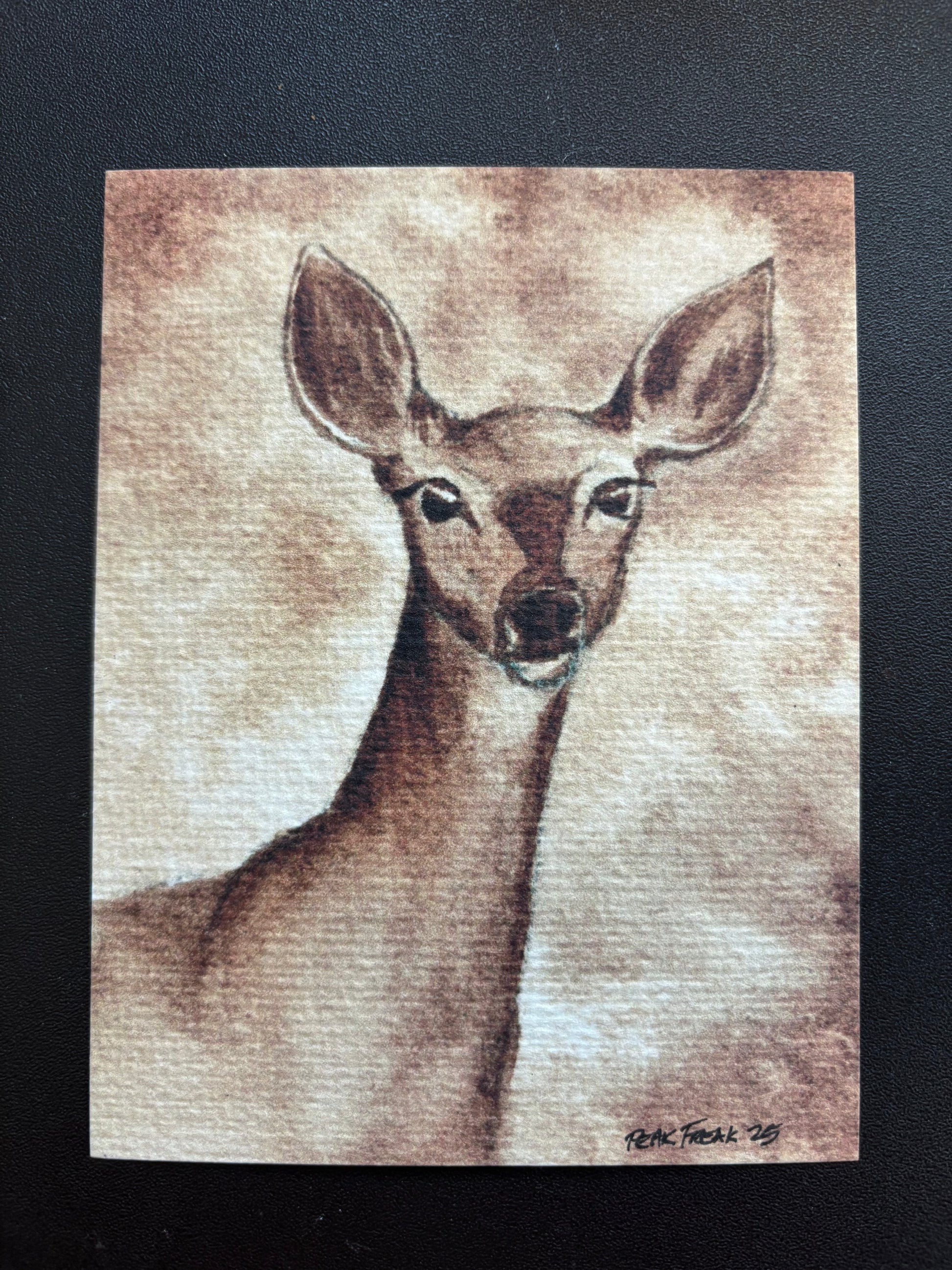 Original; Delores is a doe who frequents my studio. She's seen some things in her time. She has 2 scars, one on each of her sides. She has a limp. She's smaller than her herd mates. Mostly she's bold and fearless! I simply love her. It was only fitting that I paint her using the homemade walnut ink made from the walnuts collected on our farm.